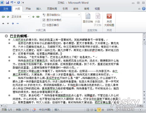 “大纲视图”主要用于设置Word2010文档的设置和显示标题的层级结构,并可以方便地折叠和展开各种层级的文档。大纲视图广泛用于Word2010长文档的快速浏览和设置中,如图4所示。
