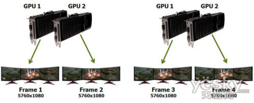 顺便再解释一下渲染方面的问题。NVIDIA此番继续使用了交替渲染模式(AFR)。在2D模式中,每一颗GPU分别渲染完整的一帧(5760×1080乃至7680×1600)。