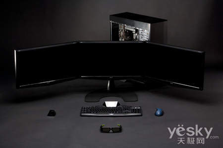 下边是用银欣乌鸦2机箱、两块GeForce GTX 480显卡、三台宏碁GD235HZ 23寸显示器(后边是两台附加显示器)、NVIDIA 3D Vision眼镜和红外发射器套件等组成的3D Vision Surround立体三屏环绕系统。