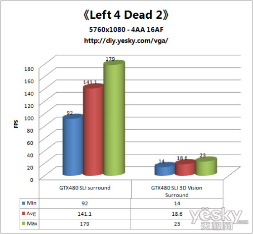 测试证明,GeForce GTX 480 SLI的性能的确非常突出,远远超过Radeon HD 5870 CrossFire、Radeon HD 5970,领先优势十分明显。再开启3D Vision立体技术之后,性能大幅下滑是可以预见的,不过测试的四款游戏中仍有三款保持了很好的流畅度,只有《Left 4 Dead 2》基本不具备可玩性。