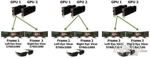 3D模式中,每一颗GPU需要同时为人的左右眼渲染完整的一帧,事实上就是一次性负责两帧,这显然是对显卡和系统性能的极大考验。
