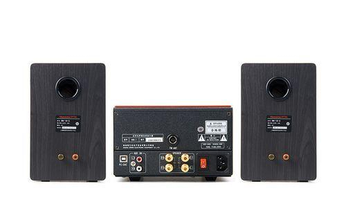 从系统背部看,箱体采用了常规的倒相式设计,圆形的倒相孔位于箱体背部靠上的位置。功放背部的接口众多,除了常规的模拟输入外,还配置了一个D型的USB接口,这是因为MM-1的功放还能作为外置USB声卡使用,配合前面的耳机接口,它还是一个解码耳放。除了这些接口,产品还可以收听FM,音箱的四个接线柱上方就是FM的天线接口。