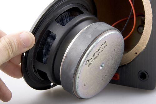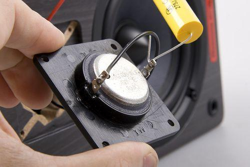 我们先将产品的高音单元卸下,在高音单元后部,我们发现了一个电容。于是我们将注意力放到了音箱内部,发现没有单独的分频器,估计靠的就是这个电容了。