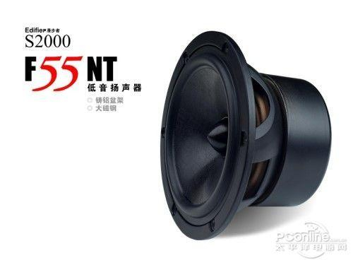 F55NT是Edifier专为S2000开发的低音扬声器,它采用对称磁路、长冲程设计,使得低音质量大大改善。振膜采用纸浆结合编织棉线而成,表面涂有特殊涂胶,有效的提高了低音力度感和纯度,指数曲线形的振膜剖面能够极大的减少分割振动带来的音质下降。为了获得更好的高刚性和稳固性,F55NT采用了一体化铸铝盆架,这样有效的降低盆架共振所带来的失真,铸铝盆架也给扬声器带来了更好的品相……和昂贵的成本。