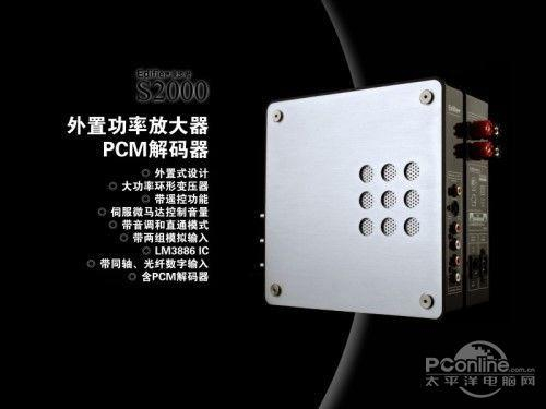 S2000 外置功放中整合高品质PCM D/A解码器,采用Burr-Brown著名的PCM17XX系列DAC芯片,PCM17XX在HiFi音源设备中被广泛采用,主要用于中高档CD唱机设计当中。Edifier会根据市场需求推出采用不同DAC的S2000。