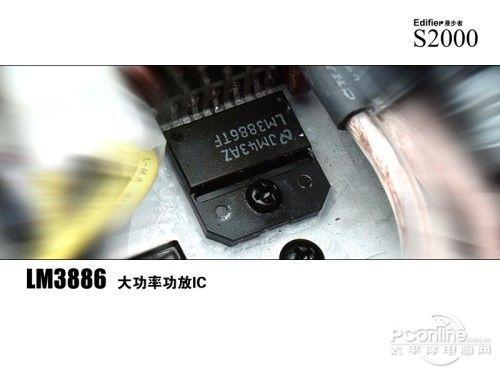 S2000采用大功率功率放大IC——LM3886,以及一只硕大的O形变压器。S2000额定功率高达80W,每种IC都有自己的失真大小,这个失真大小不是一成不变的,往往随着功率的提高,失真也是跟着提高,在相同的功率输出的情况下,大功率IC能够提供比小功率IC低不少的失真率。换用大功率IC对改善任何情况下的音质都有帮助,而且效果是非常明显的。实际测试表明,在每声道20W输出时,S2000功放总谐波失真率(THD+N)小于万分之五,这样的实测结果是20W的功放IC很难做到的。