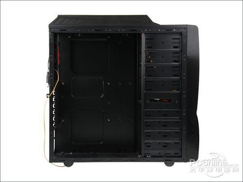 暗殿骑士机箱内部一样采用了黑化设计,做到表里如一。机箱内部的空间还是很大的,完全可以支持较大的ATX主板。不过从机箱的宽度来看,类似5970这样的超长显卡应该是安装不下了。底板有预装的主板安装铜柱,可以根据需要进行调整,还有冲压的加强凹槽,整个机架很牢固。