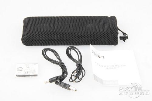 打开产品包装,内附便携音箱主体一个、黑色网状便携带一个、USB充电线一条、模拟音频线一条、700mAh锂电一枚以及一本说明书。