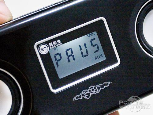 液晶显示屏为单色,按下暂停键后,会显示PAUS字样,并且会有静音字样显示。显示屏右上角为电量显示,下标则是输入音源类别显示。