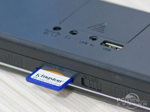 SD卡插槽位于音箱底部,为自动弹出式,稍稍按下SD卡尾部后,SD卡会弹出。