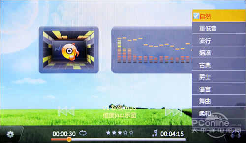 同时为用户提供了9种EQ,分别是自然、重低音、流行、摇滚、古典、爵士、语言、舞曲以及柔和。
