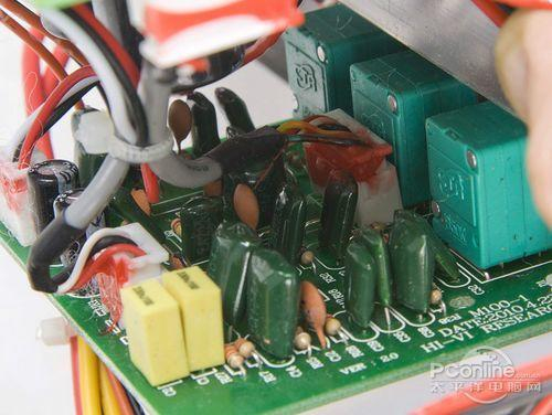 背板上,整合了一个功放电路板和一个调音电路板,电路板采用了高档玻璃纤维板,整体做工虽然没办法与HiFi功放的内部做工相比,但是对于多媒体音箱来说,已经算是相当不错了。与H4不同的是,为了增强散热效率,功放芯片的背面被加上了铝制散热片。