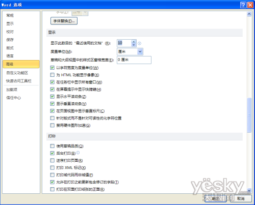 第2步,在打开的“Word选项”对话框中,单击“高级”按钮。在“显示”区域将“显示此数目的‘最近使用的文档’”数值调整为0即可清除最近使用的文档记录,并关闭Word2010文档历史记录功能,如图2所示。
