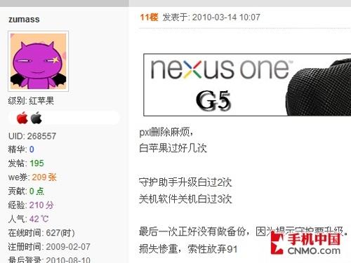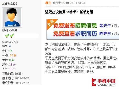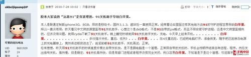 熟悉或用过iPhone的网友对白苹果这个词一定都不陌生,白苹果指的是iPhone由于软件错误,造成无法进入系统,始终停留在开机界面,并无法进行任 何操作。这对iPhone来说是一个非常致命的错误,很有可能出现手机长期无法解锁等现象。通过编辑在论坛的调查发现,很多通过91手机助手安装软件的网 友都曾出现过白苹果现象。空口无凭,来看看这些网友是怎么说的。