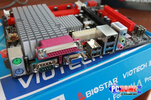 I/O接口部分与普通主板无异,提供PS/2键鼠接口,1个COM口和老式打印机接口,4个USB 2.0接口,VGA视屏输出接口、网卡接口和音频口。