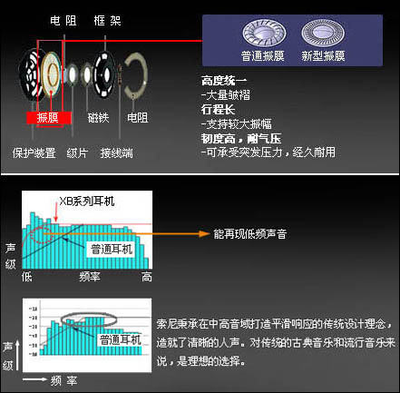 索尼官方的技术解析图看,单元的特点有三个,不过物理结构的特点有两个:一是在振膜表面加入更多的褶皱;另一个是提高了冲程,令振膜的增幅得到增大。