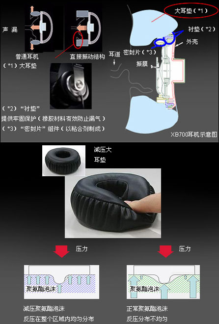 单元的外围设计是增强低频效果的第二道防线,XB700通过三方面设计令其达到其独特声音取向的目的——大耳垫、衬垫和密封片,这三方面的设计都是为了一个目的,密封!而密封带来的好处就是增强低频效果。