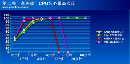 跑OR就是让CPU迅速满载,CPU温度随之而快速增加,最先到达100℃的Intel四核Q9300,只用了1分40秒左右,比AMD三核X3 435的3分15秒快了不少。理论上来说,这是比较正常的结果,毕竟四核核心更多。至于两款双核,X2 250在3分36秒达到了100℃,而E6500在4分30秒才达到。当温度达到100℃后,无论Intel还是AMD的CPU都会启动过热保护模式,CPU会自动降频,使核心温度有一定降低。