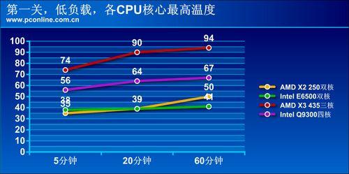 现在公布一下成绩,经过60分钟后,X2 250核心温度为50℃,E6500两个核心的温度都保持41℃左右,X3 435的三个核心都已上升至94℃的,Q9300核心温度最高为67℃。轻负载下,胜负未分,而Intel的CPU稍占优。我们接着看看第二关的比赛。
