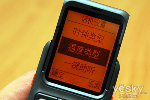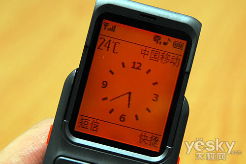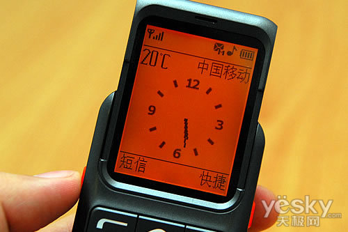 在雅器S738待机屏幕上,除常用的时钟功能外,我们看到手机内置了温度感应仪,可以测量出周围的环境温度,方便老年人进行适量的衣服增减,虽然没有预报功能,但显示温度还是非常贴心的。另外,手机内置语音播报功能,可以整点报时和阅读短信。