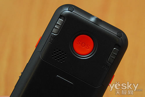 在机身背面,一颗硕大的SOS求助键非常醒目,在其左右两侧分别为手电功能开关和FM调频收音机开关,同样为拨轮式设计,通过单手即可实现操作,方便快捷。