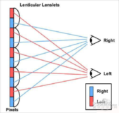 柱状透镜(Lenticular Lens)技术也被称为双凸透镜或微柱透镜3D技术,它实现的原理是在液晶显示屏的前面加上一层柱状透镜,让液晶屏的像显示平面与凸镜的平平面结合,在每个柱透镜下面的图像的像素被分成几个子像素,这样就能够像不同的方向投射子像素。当观众在观看显示屏时,由于双眼所处的角度不同,便接收到了不同的像素点叠加的不同画面,从而产生3D的效果。当然这种叠加并不是简单的叠加,由于角度的差别,这种叠加会产生一定的角度。
