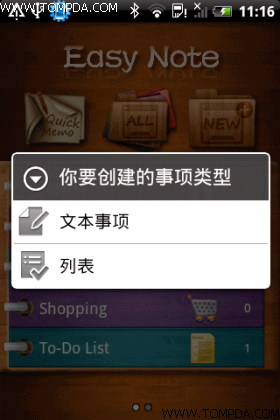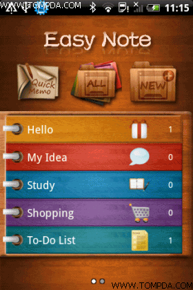 Easy Note+2do是目前记事便签类软件中用户体验最好的一款记事软件,和iPhone上著名的Awesome Note非常相似,用户体验极佳,支持自定义记事本和文件夹的图标、字体以及背景图片,具有密码保护功能,还可同步Google Docs,另外还能在记事本中添加图片、语音及视频作为附件,并且支持桌面插件功能,相当强大。