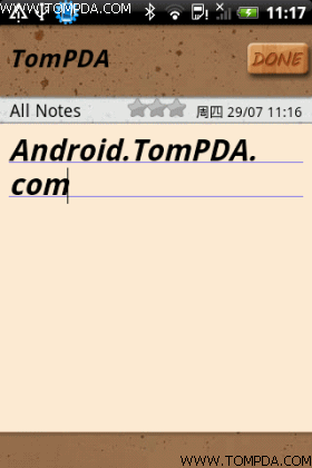 个人认为这是Android平台上最好的一款记事本软件之一,使用这款漂亮的记事软件绝对是一种享受,而且它拥有类似于画板的速记功能,这是其它记事软件所不具备的,强烈推荐!