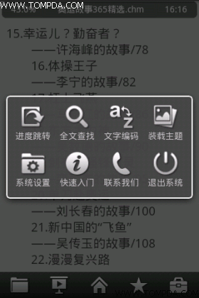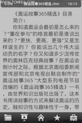 笔 者先从CHM格式的文件开始,打开速度令人满意,文字和背景的搭配也很清晰,默认的字号比较合适,就笔者个人来说无需再做过多的调整。下方依然显示的是工 具栏,上方从左至右依次为阅读进度、书名以及时间,整个界面设计简洁合理,点击屏幕中心位置的话能够看到很炫的特效并进入全屏模式阅读。