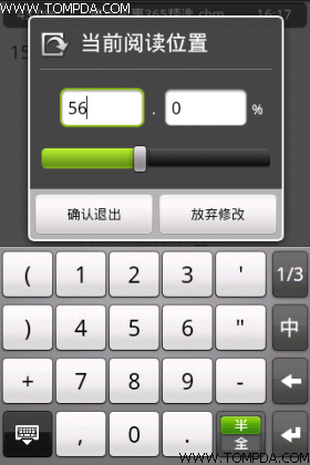 点击右下角的工具箱图标,我们可以看到进度跳转、全文查找、文字编码等常用选项,首先来看进度跳转,直接输入百分比数字或者拖动滑块便可跳转,这个在快速翻书时非常有用。