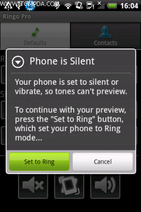 软 件主要分为两大功能,一个是全局铃声设置,另一个是联系人个性设置,分别用两个不同的标签来表示,清晰易懂。我们先来看全局设置,这里分为来电铃声、短信 铃声、高级设置以及快速切换情景模式4部分,点击左侧的播放键就可播放当前铃声进行预览,如果你的手机处于静音状态,软件会提示你打开声音,只需在弹出的 提示框中点击就可以了。开始播放后原先的播放键也会变成停止键,方便大家随时中断铃声预览。