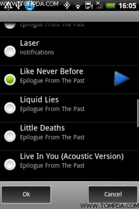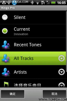 点击右侧的铃声名称我们就来到了铃声分类画面,这里会显示出当前铃音、最近铃音、全部歌曲、按艺术家分类等信息,方便大家寻找自己喜欢的铃声,选择后软件会自动播放该铃音,要点击左下角的确才算设置完毕。