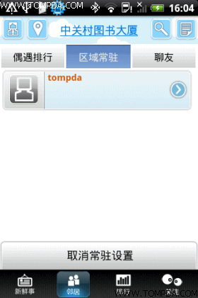 另 外,您还可以设定自己经常活动的区域(常驻区域),系统会根据所有用户的常驻区域信息为您找到和您具有相似活动区域的邻居,没准你和他/她还能在现实中偶 遇呢。该软件已经预先将全国部分大中城市按照城市的热点地区、小区、商业区、行政区划等进行了区域划分,软件运行后会自动确定您当前所在的区域,您也可以 在系统区域中创建您自己的区域,可以是您的居住小区,您的公司,店铺区域等,方便您和您的朋友或客户的交流。