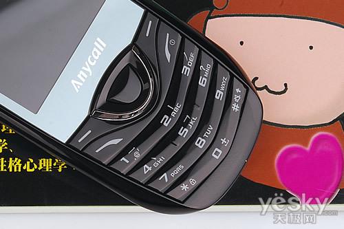 该机键盘呈“V”字形排列,个性十足的T9键盘并没有影响手机按键的手感,反而因为凸起有致的键面而提升了手指与键盘接触时的舒适度。键程与力回馈配比适中,可以满足短信达人对大量文字录入的使用需求。