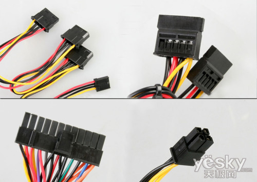 电源的接口也相当丰富,不但提供了24Pin+4Pin的CPU供电接口,还提供了双6Pin显卡供电接口,支持双卡。另外,4个D型口和两个SATA接口,也保证了用户硬盘光驱的安装需求。