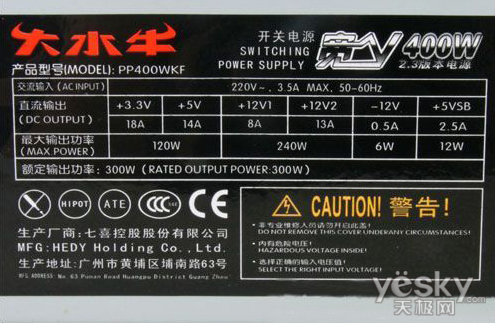 从电源的铭牌标识上可以看,这款电源的额定功率为300W,+12V1与+12V2的输出电源均达到了18A,符合Intel 2.3版电源规范的要求。另外,两路同时输出的电源小于22A,这样的设计更加安全。