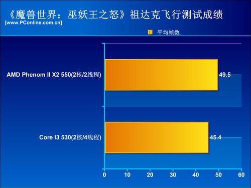 为了最大限度地吸引游戏玩家,《魔兽世界:巫妖王之怒》对电脑配置要求非常亲民,即使是最低端的平台也可以在游戏中获得属于他们的乐趣。如果想获取最佳的游戏效果以及体验的话,高性能的CPU以及显卡成为必不可少的要求,尤其是在大城市和副本上,CPU性能很关键,但这游戏又没有为多核CPU进行优化,因此高性能双核在游戏中会有更好的表现。于是我们选取了市售高性能双核AMD Phenom II X2 550和Core i3 530进行比较。