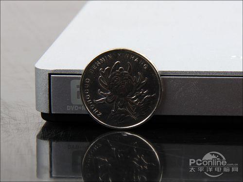 飚王 睿刻MD-S200外置刻录机外观设计十分小巧,由上图可以看到,外置光驱的厚度比1元硬币的直径还有薄上不少,适合外出携带。