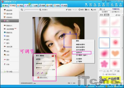 7、美白后,再给人物加一些“腮红”就可以让人物的气色更加红润了,如图8所示,调节好腮红的大小、角度和透明度后选择“全部合并”。