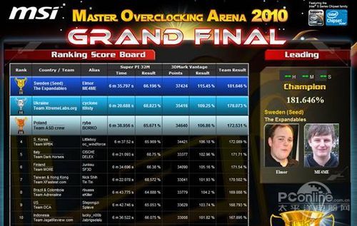 全球知名主板与显卡制造商微星科技,经过长达三个月的各地区资格赛,选出20组来自全球各地的超频精英战士,于9月11日台大体育馆中,进行MOA 2010全球超频总决赛。现场经过长达6小时的两项严苛效能测试,最终由来自瑞典的Expandables队以181.646%的惊人性能提升,获得最后的优胜,不但顺利带走各项MOA星战配件,更独得3000美元的奖金,是本届赛事的最大赢家!而乌克兰的XtremeLabs.org队与波兰的ASD crew队,则分别获得2、3名。