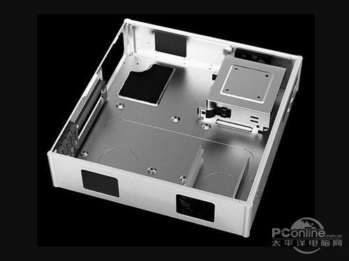 从外观上看,技展 高清三号机箱显得颇为娇小精致,整体尺寸为331mm(长)x200mm(宽)x160mm(高),体积约为10.6升,是普通ATX机箱体积的1/3大小,可以很好的融入客厅家居环境中。可以看到,技展 高清三号机箱内部空间布局清晰,电源位、光驱位和一个硬盘位被设计在机箱的前半部分,而后半部分则由主板位、另一个硬盘位以及一个PCI-E扩展槽组成。