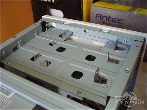 5.25寸驱动器固定在一个可抽取式的驱动器的笼装的结构当中,笼子被6颗螺丝可靠的固定住了。在联力 PC-V800机箱内的一个狭窄的侧面旁,Lian Li用一对具有直线性的凹陷的轨道用以固定硬盘。和大部分机箱制造商不同,他们用这些塑料轨道防止了硬盘的滑动,可以使得硬盘更加安全可靠。