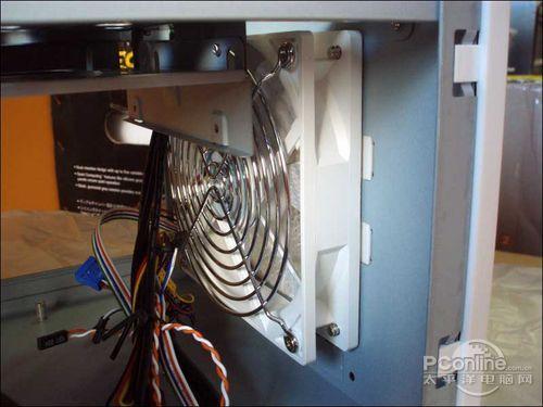 联力 PC-V800机箱的双60mm排气散热风扇,这和顶部风道位的80mm风扇不同的是,尺寸为80mm的风扇是用3针的接口接入主板的,而这两个60mm的风扇则是使用了大四针的接口。后挡板处联力使用手扭螺丝去固定。但是那是一种理论的设计,但是实际上有些螺丝被上方的金属遮住,如果手稍大那么用手去扭动螺丝还是有些困难的。最终准备一个螺丝刀总是一个好的选择,但是这样它就发挥不出手扭螺丝的方便的优点了。