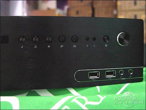 在先马 HTPC-Q1机箱的前面板左边设计有一个前置光驱位,同样采用了铝质拉丝设计,颇具时尚感。前面板右边除了具有一个金属质感包圈的圆形开关外,还设置有一排多媒体功能按键和电源灯、硬盘灯。而两个USB接口和音频接口则设计在右下角的位置,并采用金属线包围的醒目设计。