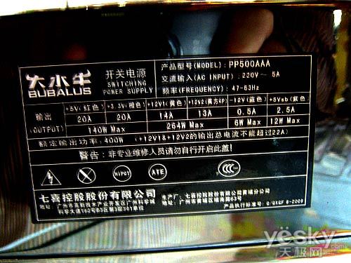从铭牌上可以知道,大水牛牛魔王PP500AAA额定功率为400W,最大输出功率为500W。符合英特尔ATX12V 2.3版供电规范,能够为独立显卡提供更好供电支持。双路+12V设计,输出电流分别为13A和14A,能够很好支持四核处理器及HD4870/GTX260级别显卡。+5V和+3.3V各电流输出均为20A,最大输出功率为140W,可以顺利支持四硬盘双RIAD阵列。