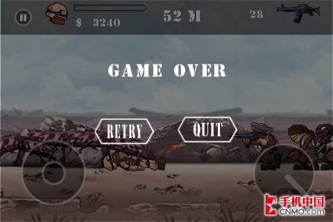 沙漠要塞Desert Slug V1.0版很明确的一点就是:绝对是合金弹头的仿真版,并且在iPhone上试玩时,每到激烈之处,总是能够很遗憾的牺牲掉,主要是因为游戏的触控键在这季节这天气下,由于手上出汗特别容易操控失灵,很让人恼火。