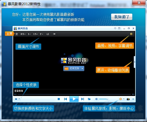 首先我们来看看暴风影音。暴风影音在第一次启动的时候就会出现一个小教程,告知用户软件界面的基本功能,非常的人性化。在软件完全启动完毕后,我们看到软件的界面分为了三部分,播放窗口,播放列表,和暴风盒子。整个界面看起来并不是很简洁。