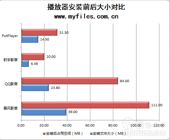 通过直观的表格对比,我们发现首轮比拼的最大赢家是射手播放器,无论从软件体积,软件安装速 度,以及软件人性化程度上,都占领了绝对的优势,6.46MB的安装文件使得用户获取非常容易,相比之下暴风影音将近40MB的体积就显得臃肿了许多。 QQ影音则是中规中矩,表现中等。至于PotPlayer,鉴于前面所说的一些原因,暂不列入对比。