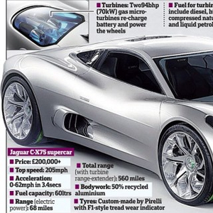 新的捷豹C-X75汽车是由锂电池提供动力,四个电力发动机分别驱动一个车轮,68英里(约合110公里)内可以实现零排放。此后,它需要依靠后置超高效燃气涡轮机生产额外的电力,使其一箱60升的燃料最大续航里程可达560英里(约合901公里)。此外,它的二氧化碳排放量也因此减至最低,每公里仅28克。巴黎车展上展出的车型可以使用电池和燃气涡轮发电机产生动力来源。但是,捷豹汽车表示,C-X75同样也使用传统的汽油发动机。
