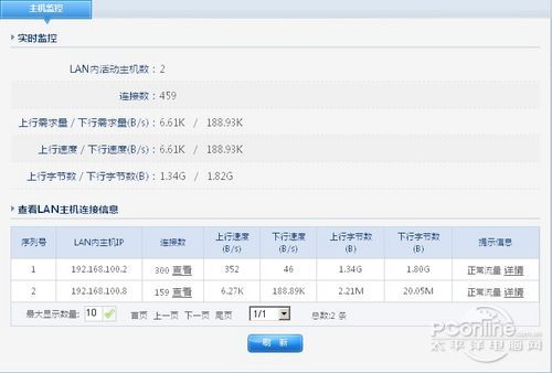 在主机监控里我们可以看到路由器下有多少个用户正在连网,它们的流量使用情况,以及当前的速度、还有每个IP的连接数。
